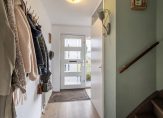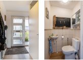 De ruime hal aan de voorzijde beschikt over een garderobehoek, meterkast, het toilet en de trapopgang naar de verdiepingen. Het toilet is netjes afgewerkt, deels betegeld en voorzien van een hand wasbakje en mechanische afzuiging.