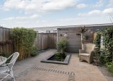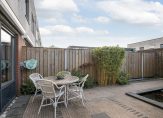Via de dubbele openslaande deuren bereikt u de zonnige, 9 meter diepe achtertuin op het zuidwesten: een heerlijke plek waar u van de middag tot in de avond van het zonnetje kunt genieten. De onderhoudsarme tuin beschikt over een groot terras met elektrische zonwering, houten erfafscheidingen met betonnen palen, een vijver en een achterom.