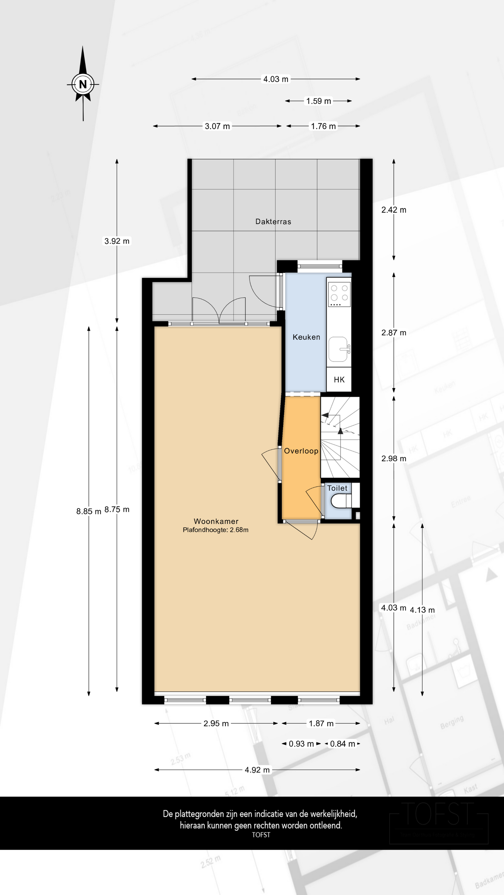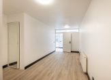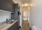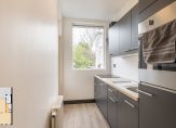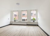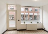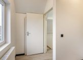 Via de overloop is er toegang tot het toilet wat volledig is betegeld en voorzien is van een wandcloset, de keuken en de woonkamer. De ruime woonkamer beschikt over een fijne lichtinval en heeft eveneens een strakke wandwerking en fraaie pvc vloer met hoge zwarte plinten. Via de openslaande deuren aan de achterzijde is er toegang tot het dakterras van circa 14 m². Hier kan je een heerlijk plekje maken voor de warme dagen! De dichte keuken is gelegen aan de achterzijde en biedt eveneens toegang tot het dakterras. De keuken heeft een recht opstelling in donkergrijze kleurstelling en beschikt over een koelkast, oven, vaatwasser en een inductie kookplaat met afzuigkap.