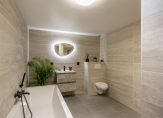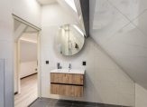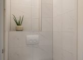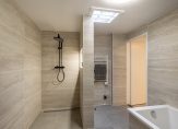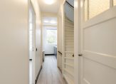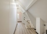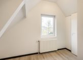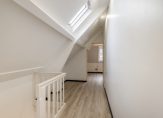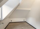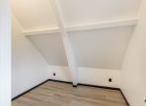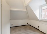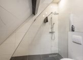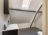 Via de overloop met nieuw geplaatst dakraam bereiken we de twee slaapkamers en de tweede moderne badkamer. Ook deze etage is geheel voorzien van een pvc vloer en strakke wanden met hoge plintafwerking. De eerste slaapkamer ligt aan de voorzijde en is circa 12 m². De slaapkamer aan de achterzijde is 8 m² groot en biedt toegang tot een kast met daarin de opstelling van de CV ketel. Ook deze tweede badkamer heeft een luxe uitstraling en beschikt over een inloopdouche, wastafelmeubel en een toilet. De badkamer is voorzien van een nieuw geplaatst dakraam. Op de overloop van deze etage bevindt zich de aansluiting voor de wasmachine.
