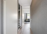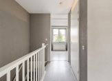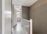 Ruime overloop met een vaste kast met de cv-combiketel, opstelling wasmachine/wasdroger en toegang tot alle vertrekken met een moderne hout look laminaatvloer en strakke wandafwerking.