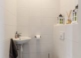 Entree woning, ruime ontvangsthal voorzien van meterkast, modern toilet met hangend closet, hand wasbakje, betegeld tot het plafond en mechanische afzuiging.