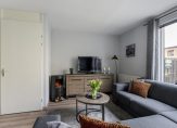 Lichte woonkamer circa 28 m² voorzien van moderne hout look laminaatvloer, strakke wandafwerking, airconditioning, trapkast en een schuifpui naar de achtertuin.