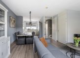 – Lichte woonkamer voorzien van moderne hout look laminaatvloer en schuifpui naar de achtertuin;