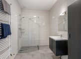 Moderne badkamer circa 6 m² voorzien van inloopdouche, wastafelmeubel met een spiegel, hoge kast, design radiator, betegeld tot het plafond en mechanische afzuiging.