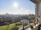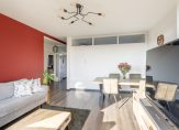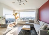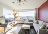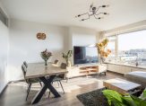 De lichte woonkamer is gelegen aan de achterzijde van het appartement en heeft een waanzinnig uitzicht over de wijk. De wanden zijn strak afgewerkt en er ligt een moderne laminaatvloer, door de grote raampartijen komt er veel natuurlijk licht de ruimte in.