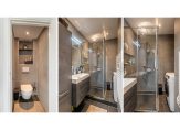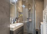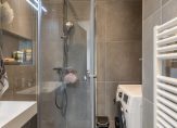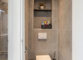 De badkamer heeft een moderne grijze betegeling en is voorzien van een douchehoek, wastafelmeubel met spiegel- en bergkast en de aansluiting voor de wasmachine. De toiletruimte is separaat gelegen, heeft dezelfde betegeling als de badkamer en is voorzien van een wandcloset. Beide ruimtes hebben een verlaagd plafond met inbouwspots.