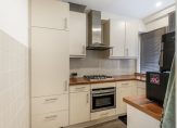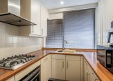De U-vormige keukenopstelling is aan de voorzijde van het appartement gelegen en is voorzien van een 4-pits gaskookplaat, afzuigkap, koelkast en combimagnetron. Ook is er veel kastruimte aanwezig.