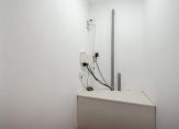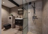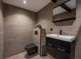 – Moderne geheel betegelde badkamer met inloopdouche, wastafelmeubel, hangend closet en inbouwspots;