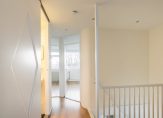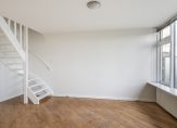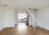 De zonnige woonkamer van circa 25 m² is gelegen aan de achterzijde, heeft een parketvloer, strakke wandafwerking, een vaste trap naar de slaapverdieping, kast met opstelling wasmachine en een deur naar het balkon van circa 8 m².