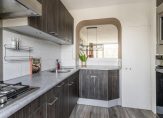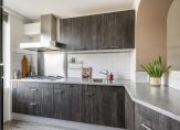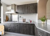 De moderne, hout look half open keuken aan de voorzijde is circa 6 m² groot en voorzien een gas kookplaat met afzuigschouw, oven, vaatwasser, koel-vriescombinatie, geintegreerde spoelbak, meterkast, voldoende kastruimte en doorkijkje naar de eetkamer.