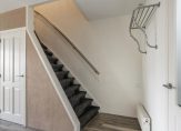 Entree woning, tochthal naar hal met garderoberuimte, een vaste trap naar de slaapverdieping, trapkast en een keurig toilet met raampje, hand wasbakje en gedeeltelijk betegeld.