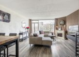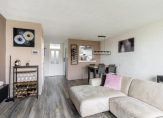 De zonnige woonkamer van circa 30 m² is gelegen aan de achterzijde en heeft een moderne hout look laminaatvloer, strakke wandafwerking en dubbele openslaande deuren naar het balkon van circa 8 m².
