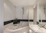 De keurige badkamer van circa 4.5 m² is voorzien van een hoek ligbad, een wastafelmeubel met spiegel, mechanische afzuiging en een vaste kast voor de wasmachine en wasdroger.