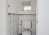 Keurig toilet, gedeeltelijk betegeld en voorzien van luchtafvoer.