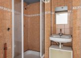 Badkamer circa 3 m² met douchecabine, wastafelmeubel met spiegel, opstelling wasmachine en mechanische afzuiging.