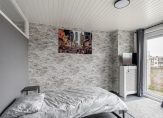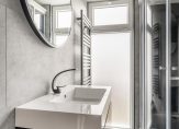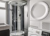 – Moderne, in 2024 vernieuwde, badkamer. Geheel betegeld en voorzien van een douchehoek met massagestralen, wastafelmeubel met verlichtbare spiegel, inbouwsports en aansluitingen van de wasmachine en droger;