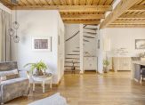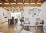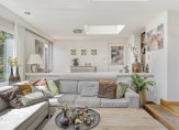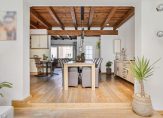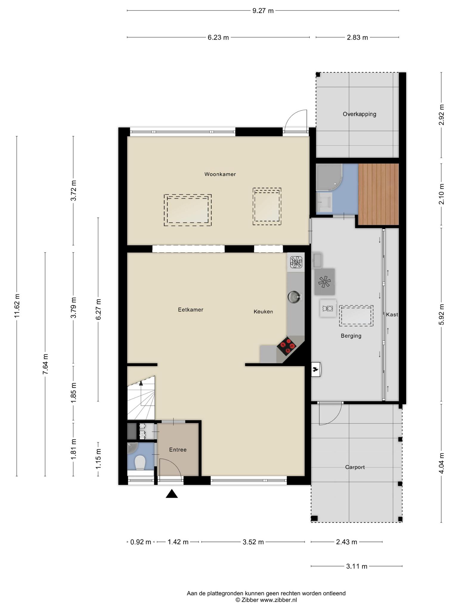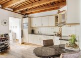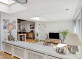 Hal met nette toiletruimte en meterkast. Bij binnenkomst in de woonkamer valt gelijk de enorme leefruimte op, waarbij een speelse indeling is ontstaan door de uitbouw aan de achterzijde. Aan de voorzijde van de woning is een zithoek, maar ook aan de tuinzijde is een iets verlaagd zitgedeelte. Er ligt een massief houten vloer in de leefruimte. In het midden van de woning is de open keuken met lichte inrichting voorzien van combi oven/magnetron, vaatwasser, koelkast, inductiekookplaat en geheel afgewerkt met een granietenblad en aansluitend eettafel.