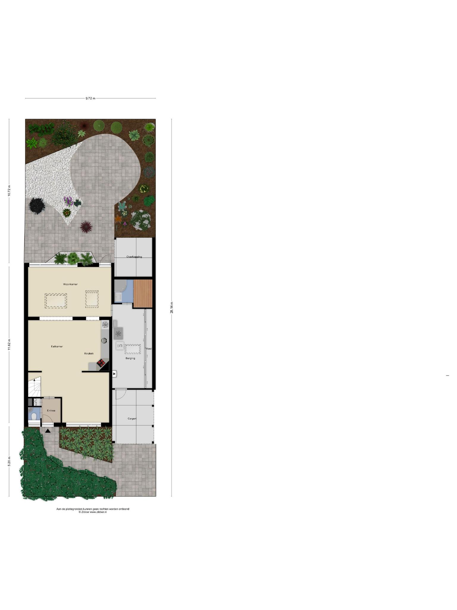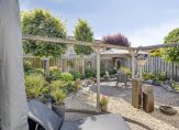 De tuin is zowel aan de voorzijde als achterzijde keurig aangelegd. Aan de achterzijde ligt de tuin op het zuidwesten. Er is een overdekt terras en rondom is de tuin voorzien van keurige schuttingen. In de tuin staat veel beplanting en enkele bomen. Aan de voorzijde beschikt de woning over een oprit met carport.