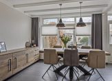 Hal met meterkast en keurige toiletruimte uit 2017. De woonkamer is ruim van opzet door de aanbouw aan de achterzijde. Over de gehele benedenverdieping ligt dezelfde tegelvloer met vloerverwarming. In de woonkamer is nog een gesloten gashaard geplaatst, die naast gezelligheid ook kan zorgen voor verwarming. De keuken is uit 2004 en compleet uitgevoerd met onder andere een vaatwasser, combi oven/magnetron, koelkast, inductiekookplaat, vrieskast en apothekerskast. Er is een voorraadkast de keuken onder de trap naar de 1e verdieping.