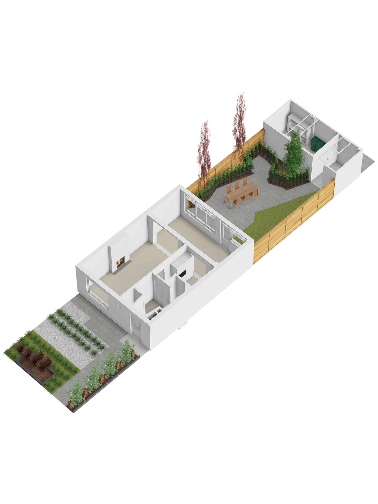 De voor- en achtertuin zijn keurig aangelegd. Aan de achterzijde is de tuin voorzien van terras en kunstgras. Achter in de tuin staat een stenen tuinberging met elektra. De tuin is achterom bereikbaar via een brandgang en gelijk gelegen aan een groot speelveld. Heerlijk vrij dus! De voortuin is aangelegd met mooie plantenbakken, verlichting en houten palen naast het pad naar de voordeur. Parkeren kan aan de straatzijde recht voor de deur.