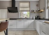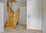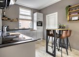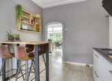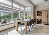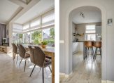 Ruime hal met (vernieuwde) meterkast en cv.-kast (Nefit HR combiketel uit 2019). In de hal is ook de trap naar de verdieping. Vanuit de hal is toegang tot de woonkeuken met moderne inrichting voorzien van inductiekookplaat met geïntegreerde afzuiging, vaatwasser, koelkast, combi oven/magnetron en een kokend water kraan. Op de vloer in de keuken ligt een travertin vloer met vloerverwarming, welke doorloopt in de woonkamer. De woonkamer heeft een grote erker aan de zijkant van de woning en daardoor is dit een fijne lichte woonkamer.
