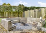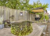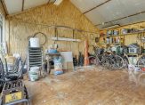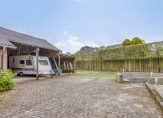 De tuin is grotendeels verhard met betonklinkers en verder voorzien van een gedeelte met kunstgras, een vijver, verhoogd terras met houten vlonderplanken en een zitkuil. Door de aanwezige verharding en de grote dubbele poort aan de voorzijde van de woning is het bijgebouw ook makkelijk bereikbaar. Het bijgebouw is op dit moment ingedeeld in een gedeelte dat als opslag-/stallingsruimte (ongeveer 33 m²) wordt gebruikt en een gedeelte als hobby-/ontspanningsruimte (ongeveer 88 m²). Deze laatste ruimte is verwarmd middels gevelkachels. Hier zijn ook toiletten aanwezig en een vliering. De overkapping aan de achterzijde biedt ruimte voor het stallen van een caravan/camper en/of aanhangers en bestelbusjes.