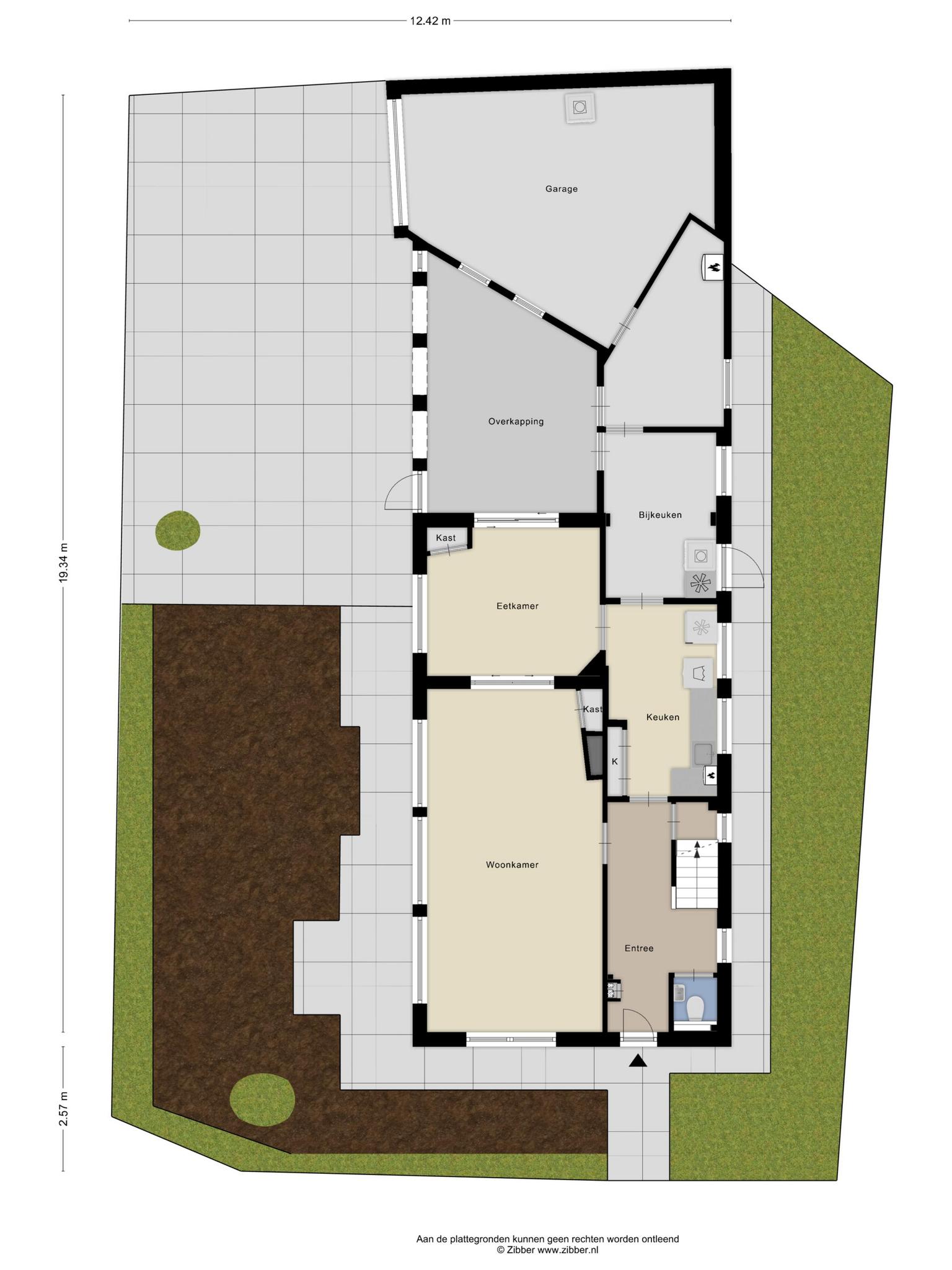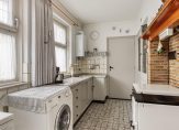 Entree met meterkast, toiletruimte met wandcloset en fontein en trapopgang naar boven. Onder de trap is toegang tot een ruime kelder waar u genoeg voorraad droog en koel kunt bewaren. De lichte woonkamer is totaal 38 m² groot en bestaat uit een zitkamer en eetkamer welke gescheiden kan worden met fraaie glas-in-lood ensuite-schuifdeuren. Er zijn twee vaste kasten. Rondom zijn ramen waardoor u verzekerd bent van veel lichtinval en een leuk uitzicht. Een schuifpui geeft toegang tot het overkapte buitenterras. De dichte keuken is toegankelijk vanuit de hal en de eetkamer en is voorzien van een eenvoudige inrichting. Vervolgens komt u in de bijkeuken met de witgoedaansluiting. Vanuit hier is er zowel een deur naar de tuin aan de linker- als de rechterzijde van de woning. Ook is er nog volop bergruimte in de berging en ruime garage. Deze garage is voorzien van een elektrische garagedeur. Parkeren kan op uw eigen terrein voor de garage. Tussen de garage en de eetkamer is een overkapping waar u een heerlijk beschut terras heeft. De totale zijtuin is ca. 6 m diep x 21 m breed waardoor er naast parkeergelegenheid een mooie tuin overblijft. U kunt er desgewenst voor kiezen de tuin te vergroten.