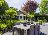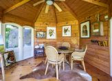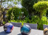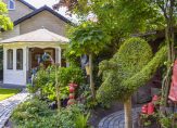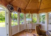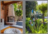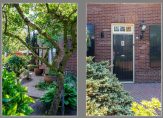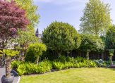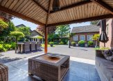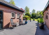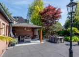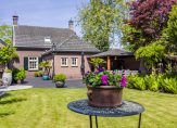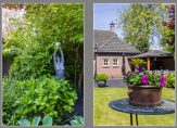 De tuin is royaal en keurig aangelegd met een groot terras aan het huis, een gazon, grote overkapping en veel groen aan planten, bomen etc. Er is een beregeningssysteem aanwezig, waarmee zowel de voor- als achtertuin te besproeien zijn. Aan de woning is een veranda van circa 16 m² gebouwd, welke een fijne beschutte plek geeft om te zitten en van de tuin te genieten. Er is nog een buitenhaard bij aanwezig. Achter in de tuin staat een houten tuinhuis/prieel dat in gebruik is als atelieruimte. Door de ramen die er rondom zijn is dit een heerlijke werkruimte dan wel een extra overdekte mogelijkheid om in de tuin te zitten.