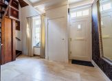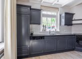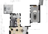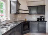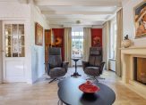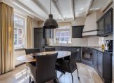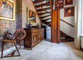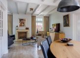 Ruime hal met meterkast en hardhouten trap naar de verdieping. De leefruimte is ingericht als woonkamer met open keuken en circa 38 m² groot. Op de vloer ligt een marmeren tegelvloer met vloerverwarming en er is een schouw met gashaard aanwezig. De wanden zijn strak gestuukt en er is een sfeervol balkenplafond aanwezig. Er is een open keuken met houten inrichting voorzien van vaatwasser, koelkast, oven, keramische kookplaat en afgewerkt met een granieten blad.