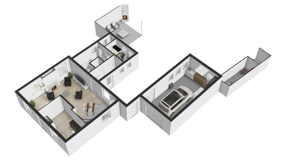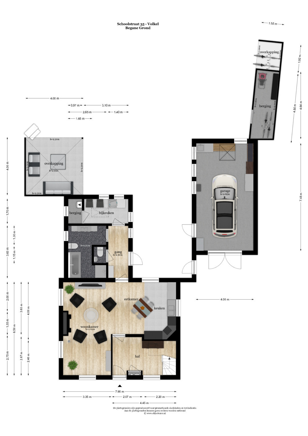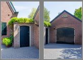 Naast het huis ligt een ruime oprit met aansluitend een vrijstaande garage. Deze garage is circa 30 m² groot en in 1979 gebouwd. Bij de bouw is de garage volledig geïsoleerd. In de garage is elektra, water en verwarming (middels een gaskachel) aanwezig. Extra bergruimte is er door de aanwezige vliering. Achter de garage staat nog een eenvoudige bergruimte voor het tuingereedschap. De voortuin is eveneens keurig aangelegd en rondom voorzien van een fraai hekwerk.