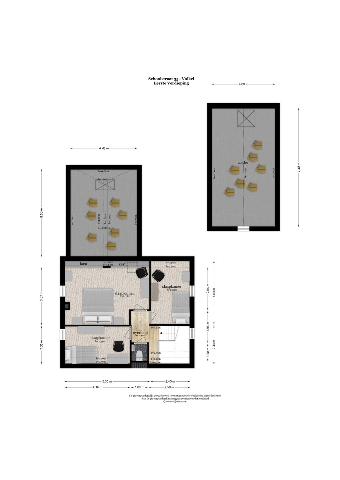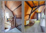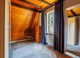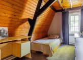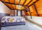 Op de 1e verdieping is een overloop met toiletruimte en toegang tot 3 slaapkamers. Op de slaapkamers ligt tapijt op de vloer. De spanten van de woning zijn hier zichtbaar en verder is alles afgewerkt met balken en kraaldelen als afwerking van plafonds en het dak. Met een vlizotrap is een grote bergzolder bereikbaar.