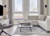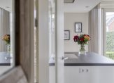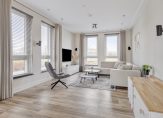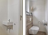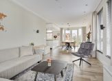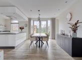 Hal met meterkast, luxe toiletruimte en trapopgang naar de verdiepingen. Op de vloer ligt een fraaie tegelvloer in houtmotief, welke ook doorloopt in de leefruimte en uiteraard is voorzien van vloerverwarming. Bij binnenkomst in de woonkamer met open keuken valt gelijk de flinke ruimte op. Met maar liefst 50 m2 leefruimte is er voldoende plaats voor een luxe keuken met kookeiland, grote eettafel en heerlijke zithoek. De muren en plafond zijn strak gestukadoord en voorzien van inbouwspots. Aan de tuinzijde zijn openslaande deuren aanwezig.
