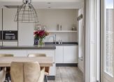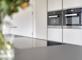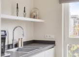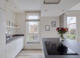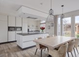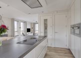 De open keuken heeft een prachtig luxe keukenopstelling met een kookeiland voorzien van inductieplaat en vaatwasser. De afzuigkap is geïntegreerd in het plafond. In de bijbehorende kastenwand zijn onder andere ingebouwd een koelkast, vrieskast, combi oven/magnetron en een aparte oven. Aansluitend is nog een aanrechtblad met RVS spoelbak voorzien van een Quooker.