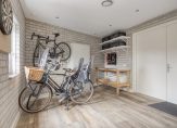 Vanuit het leefgedeelte is direct toegang tot de garage/berging. Ook hier ligt dezelfde tegelvloer in houtmotief met vloerverwarming. Deze ruimte is ook volledig geïsoleerd en voorzien van openslaande deuren naar de oprit en een deur aan de achterzijde naar de tuin. Er zijn aansluitingen/voorbereidingen aanwezig om in hier een extra wc met wastafel te maken. Een ideale ruimte om te gebruiken als bijkeuken en een berging voor de stalling van fietsen of als hobbyruimte.