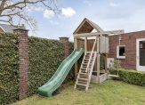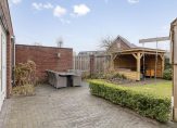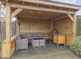 De verzorgde achtertuin is gelegen op het westen, waardoor het heerlijk vertoeven is in deze tuin. Achter in de tuin staat een houten overkapping, dit zorgt voor een fijne beschutte plek om in de tuin te zitten. Een tuin die verder keurig is afgewerkt met een gazon en een terras van gebakken stenen.