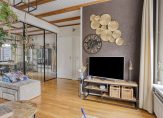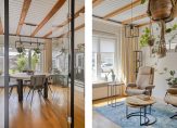 Hal met garderobe en meterkast. De ruime woonkamer heeft een parketvloer, sfeervol balkenplafond en nette wandafwerkingen. Er is een fraaie glaswand geplaatst die de woonkamer verdeeld in een zitkamer en eetkamer. In de woonkamer is een provisiekast onder de trap naar de verdieping. Via de eetkamer is de keuken bereikbaar. Deze dichte keuken is voorzien een functionele keukeninrichting met gaskookplaat, afzuigkap en oven.