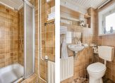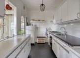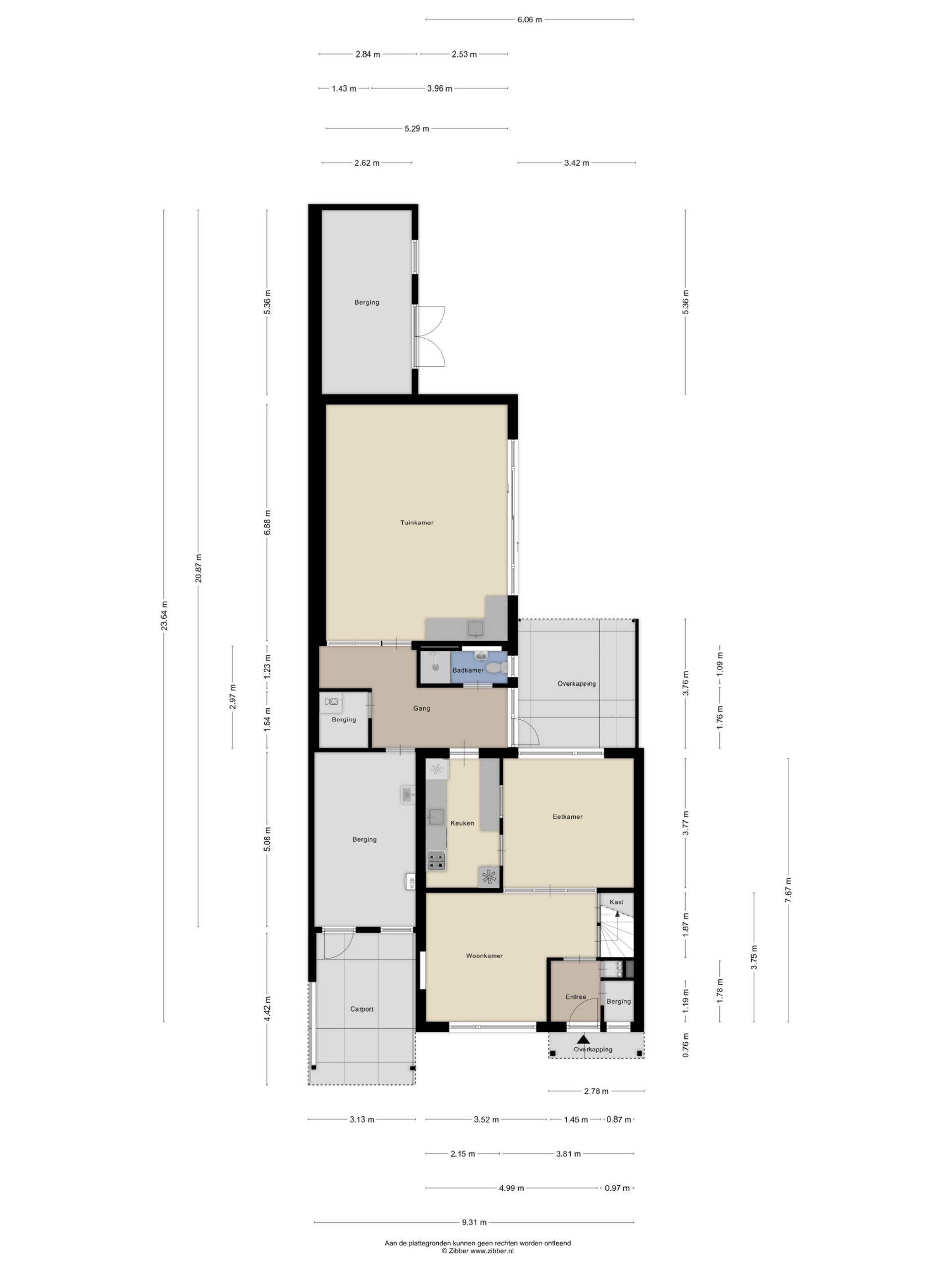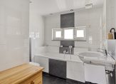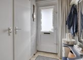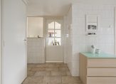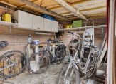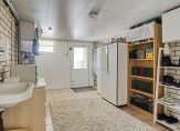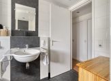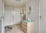 Achter de keuken is een ruime bijkeuken. Dit is een centrale ruimte met toegang tot de tuinkamer, een wasruimte, de berging, badkamer en buitendeur naar de tuin met veranda. De badkamer is voorzien van douche, toilet en fonteintje. Het witgoed staat in de wasruimte en de cv.-ketel hangt in de inpandige berging. Hier is naast bergruimte ook nog een wastafel en een deur naar de oprit met carport.