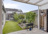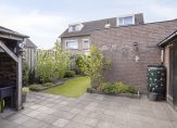 De tuin is gelegen op het noordoosten en voorzien van terras, gazon, beplanting en een eigen achterom. Aan het huis staat een veranda met tegelvloer. Dit creëert een mooi en beschut plekje om buiten te zitten met privacy. Achterin staat nog een stenen berging voor de fietsen en tuingereedschap.