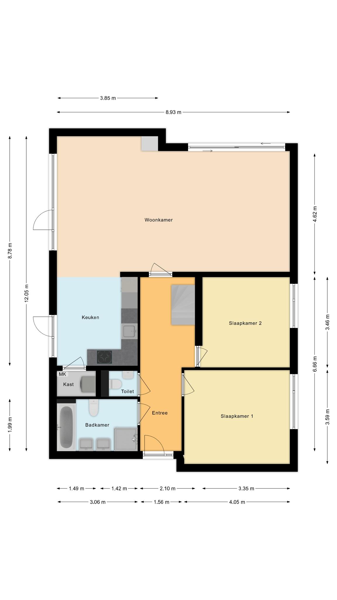 Entree, royale hal, garderoberuimte, toilet met fonteintje, toegang tot badkamer I, slaapkamer I en II, en trap naar 1e verdieping. Vanuit de hal is tevens de woonkamer bereikbaar met open keuken.