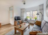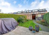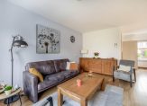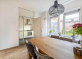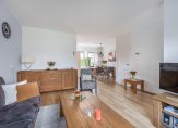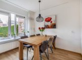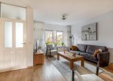 Wat in de woonkamer direct opvalt, zijn de lichtinval en het uitzicht. Het zitgedeelte is aan de voorzijde, met uitzicht naar het plantsoen, en bij het eetgedeelte kijk je naar de mooi aangelegde achtertuin. Er ligt laminaat op de vloer en er is een handige bergkast onder de trap.