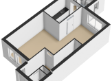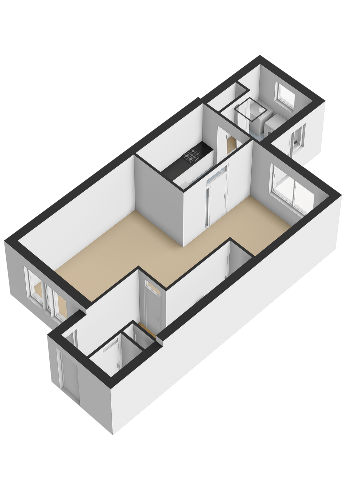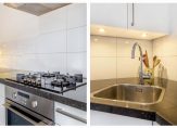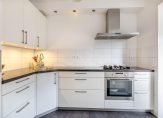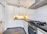 Naast de woonkamer is de dichte keuken, met een donkere tegelvloer en inbouwverlichting in de koof. De lichte hoekopstelling heeft een aanrechtblad van zwart composiet en alle benodigde apparatuur is ingebouwd: een gaskookplaat, afzuigkap, oven en een koelkast.