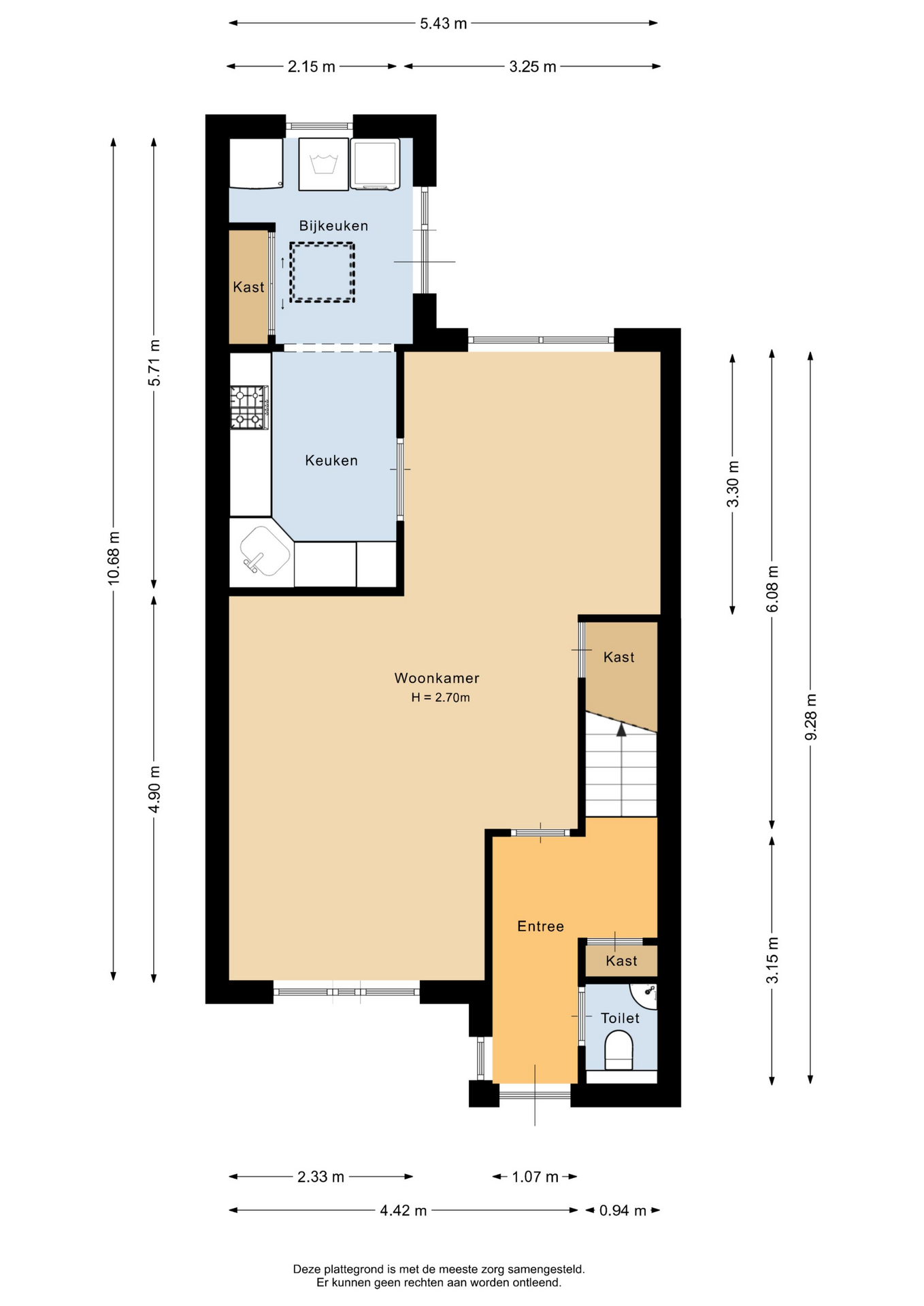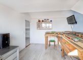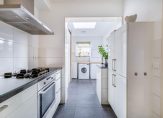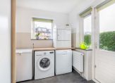 De keuken staat in open verbinding met de verwarmde bijkeuken, die toegang tot de tuin biedt. In de bijkeuken is ruimte voor de wasmachine, droger, vriezer en een vaatwasser. Aan de linkerzijde is een kast met schuifdeuren gemaakt, perfect als provisie- en bergruimte.