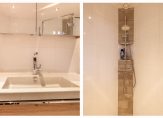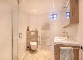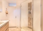 Naast deze slaapkamer is de moderne badkamer die, net als de toiletruimte, in 2018 is vernieuwd. Grote, lichte wandtegels maken de badkamer heel ruimtelijk en het plafond is voorzien van inbouwverlichting. Aan de linkerzijde is de inloopdouche, met een glazen wand en een deur. Verder zijn er een toilet, designradiator en een fraai wastafelmeubel met een spiegelkast.