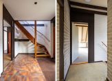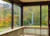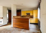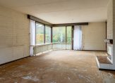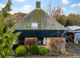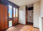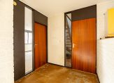 Naast de optie is de overdekte entree van deze bijzondere en verrassend ruime woning. De hal is, net als de rest van het huis, nog volop in de jaren ’70 stijl. Je ziet de meterkast, de toiletruimte met fonteintje en de hardhouten trap naar de eerste verdieping.