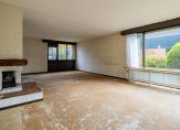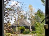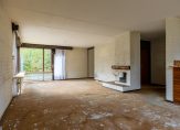 De woonkamer met open keuken heeft grote ramen aan drie zijden, met veel lichtinval en een optimale verbinding met de tuin. Het eetgedeelte is aan de voorzijde en het zitgedeelte aan de achterzijde, naast de schouw met open haard.