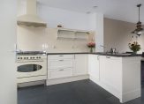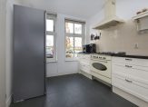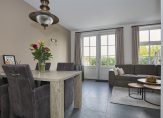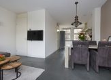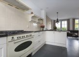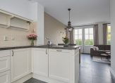 Loop je verder, dan kom je binnen in de lichte open keuken in een moderne kleurstelling. De keuken is uitgerust met diverse inbouwapparatuur, zodat koken hier niet alleen gemakkelijk, maar ook gewoon leuk is. Het eetgedeelte sluit naadloos aan op de woonkamer, waar de openslaande deuren uitnodigen om de tuin in te stappen. En voor wie van opgeruimd houdt: er is een trapkast aanwezig – ideaal voor extra bergruimte.