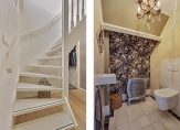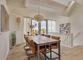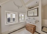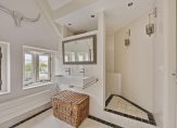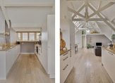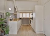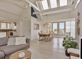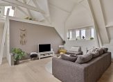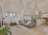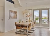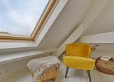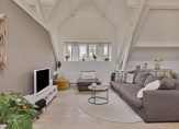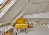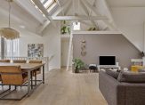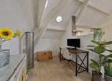 Maar we gaan terug naar de woonkamer, met een fraaie verdeling tussen het zit- en het eetgedeelte. Openslaande deuren geven toegang tot het dakterras en, heel verrassend, achter de halfhoge keukenmuur is een ruime werkplek gecreëerd. De eikenhouten vloer vormt een fraai geheel met het stucwerk en de prachtige dakconstructie. Dit is geen woonkamer, maar een unieke leefruimte om volop van te genieten.