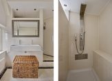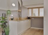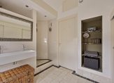 Naast de keuken is een gang met de toiletruimte en luxe badkamer. In de badkamer zie je getrommeld marmeren tegels op de vloer, een ruime inloopdouche en een wastafelmeubel. Achter de schuifdeuren is een kast met de opstelling van de wasmachine, droger en de HR-ketel.