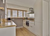 In de keuken staat een dubbele wandopstelling met een stijlvol granieten aanrechtblad, waarvan het materiaal ook als vensterbank is gebruikt. Deze keuken biedt veel bergruimte en de gaskookplaat, afzuigkap, combi-oven, vaatwasser en koel-/vriescombinatie zijn ingebouwd.